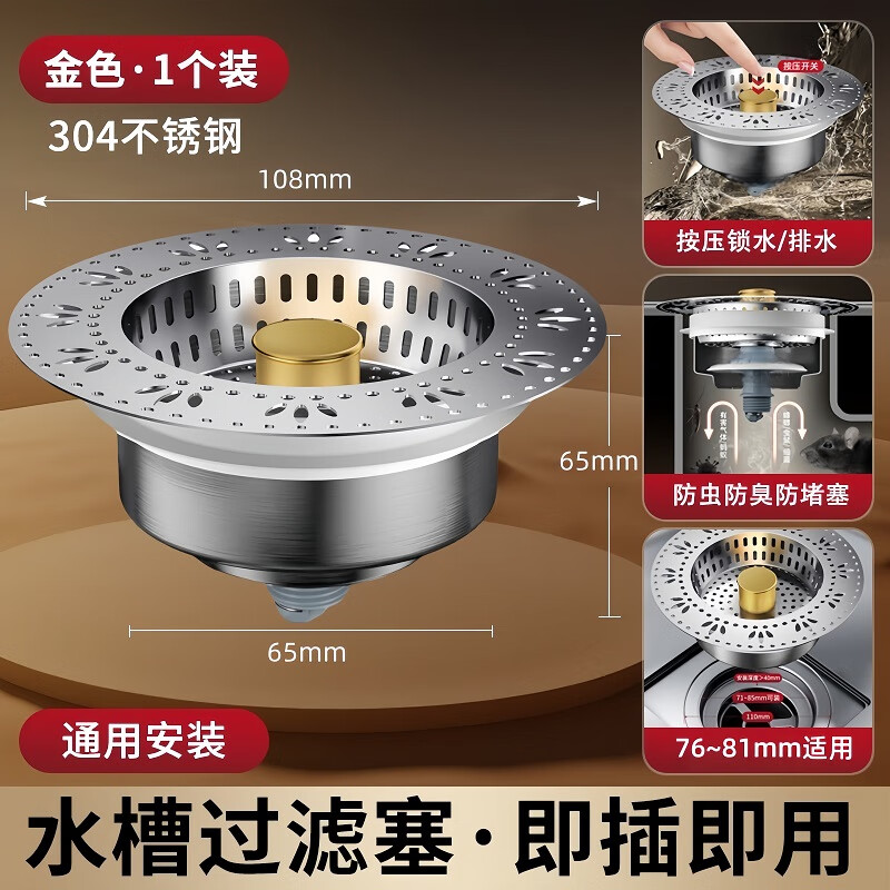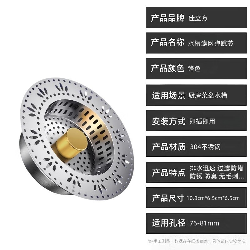商品名称: 佳立方厨房水槽过滤网洗菜盆漏水塞水槽不锈钢弹跳芯下水器洗碗池防堵塞 佳立方不锈钢厨房水槽下水器/个