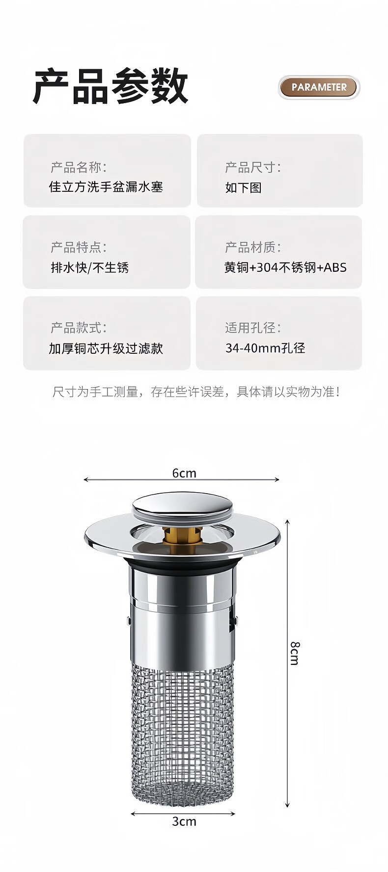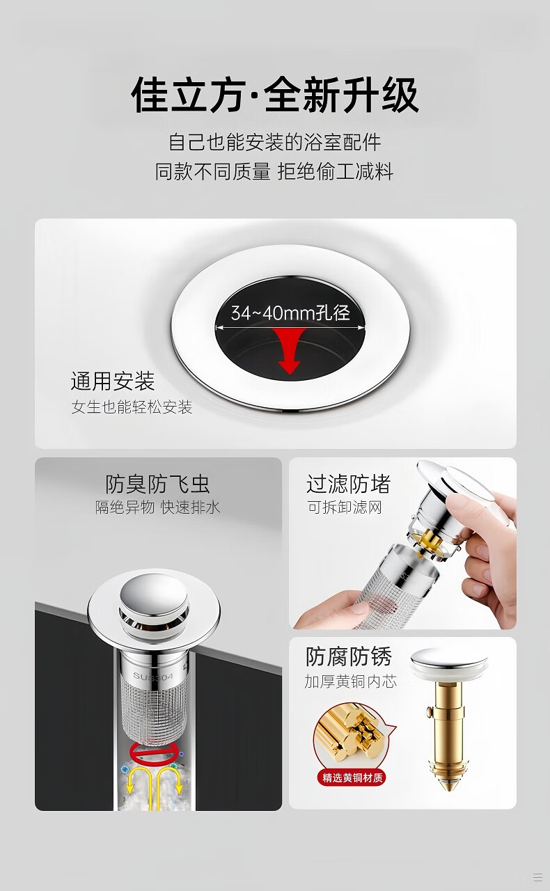 • 商品名称:佳立方洗手盆漏水塞洗手池弹跳下水器面盆水池防臭塞按压式升级铜芯款 升级防臭弹跳芯/个