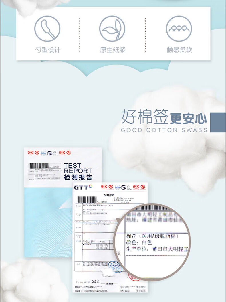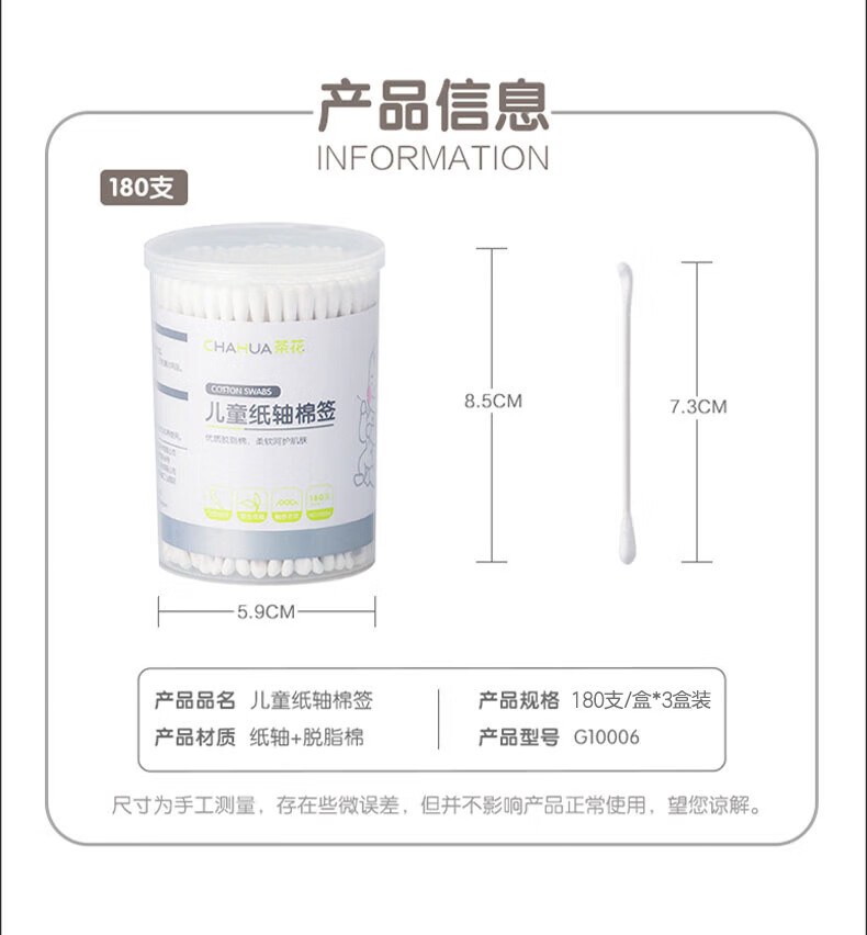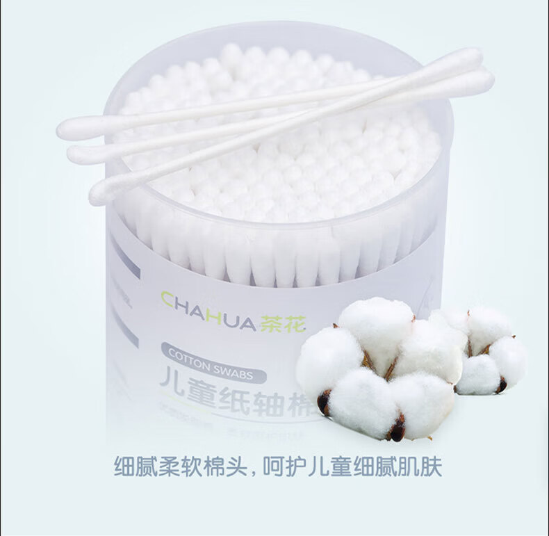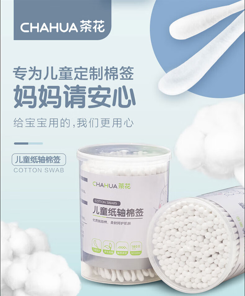 生活日用  > 日用杂货  > 日杂小件  >  茶花/CHAHUA  >  茶花 儿童棉签掏耳朵纸轴棉头耳孔鼻孔清洁棉棒 G10006 180支/罐*3罐 G10006*3/个