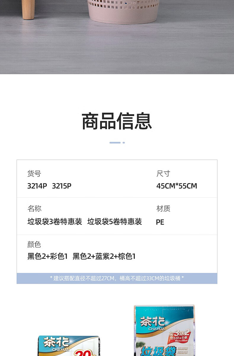 商品名称: 茶花垃圾袋加厚家用断点式塑料袋清洁袋45*55cm10卷共250只3215P 3215P/个