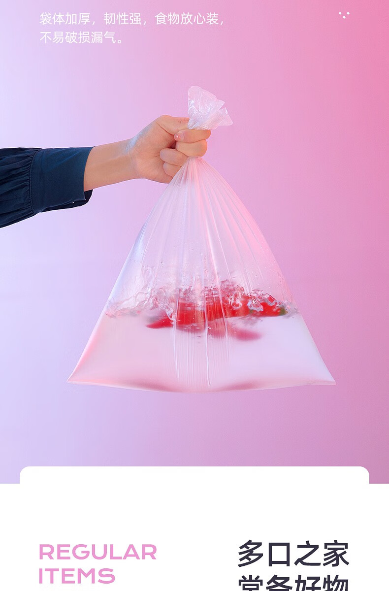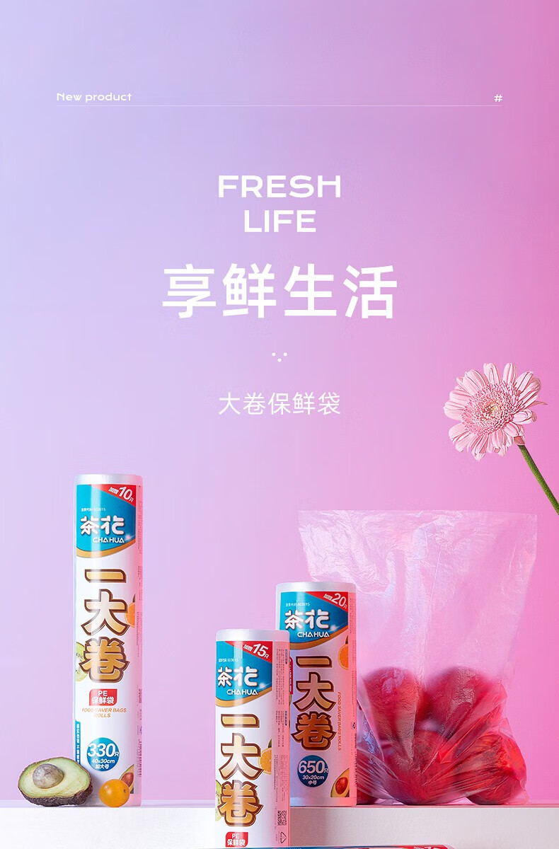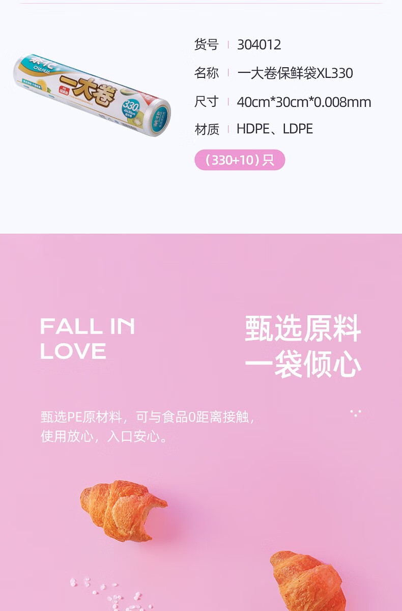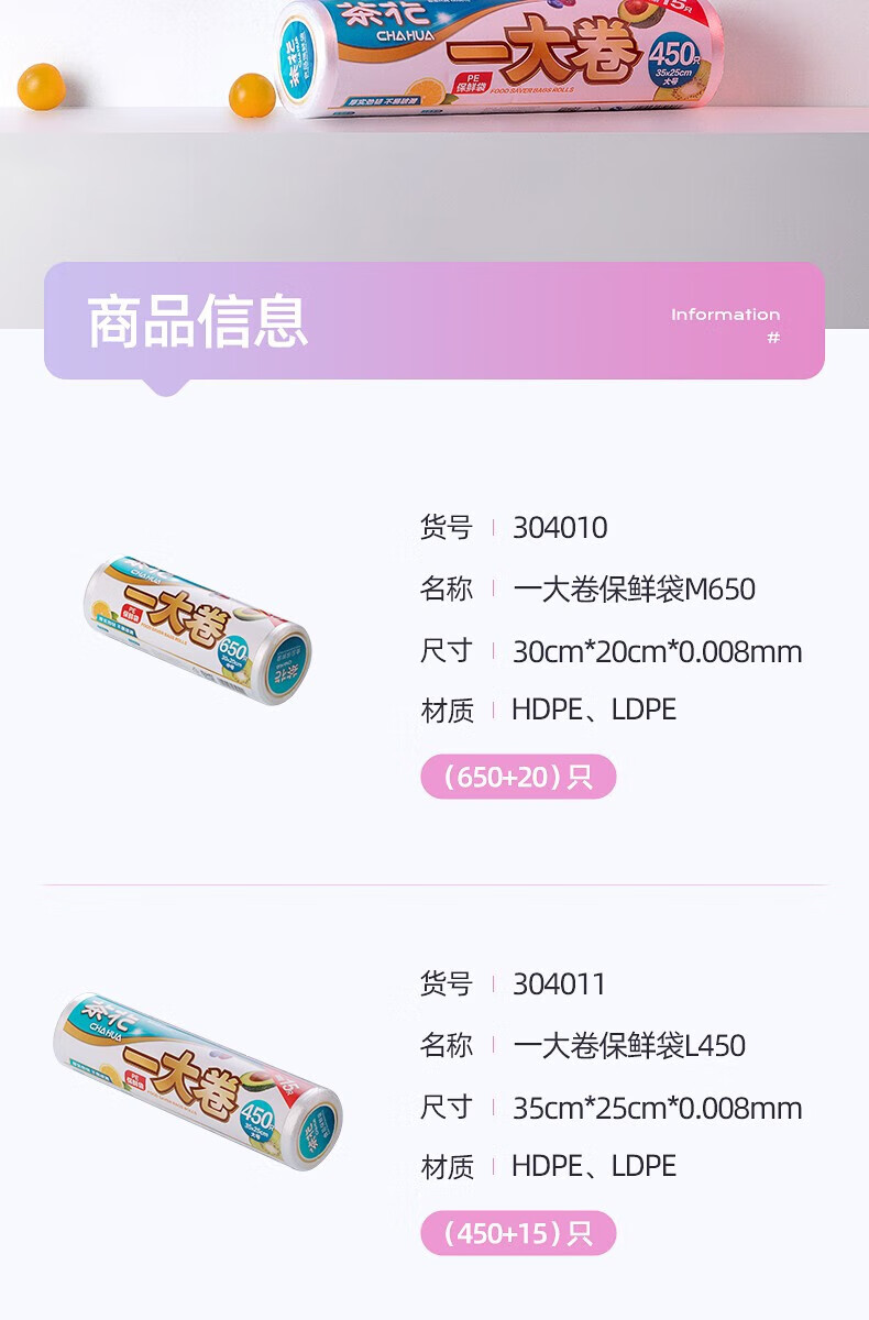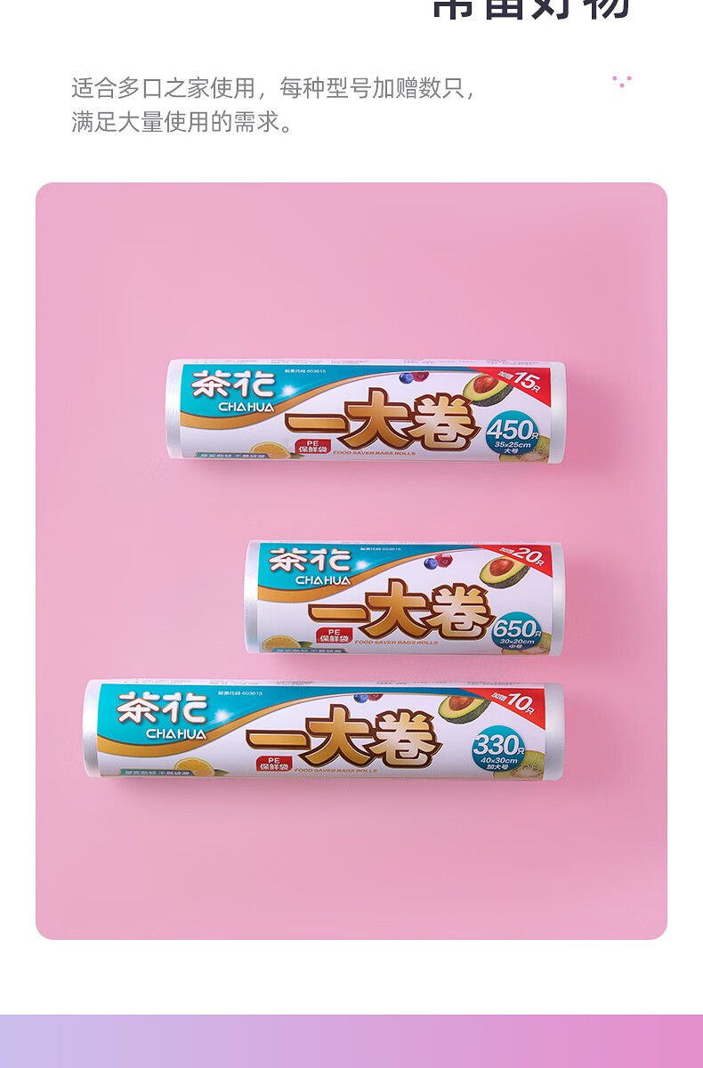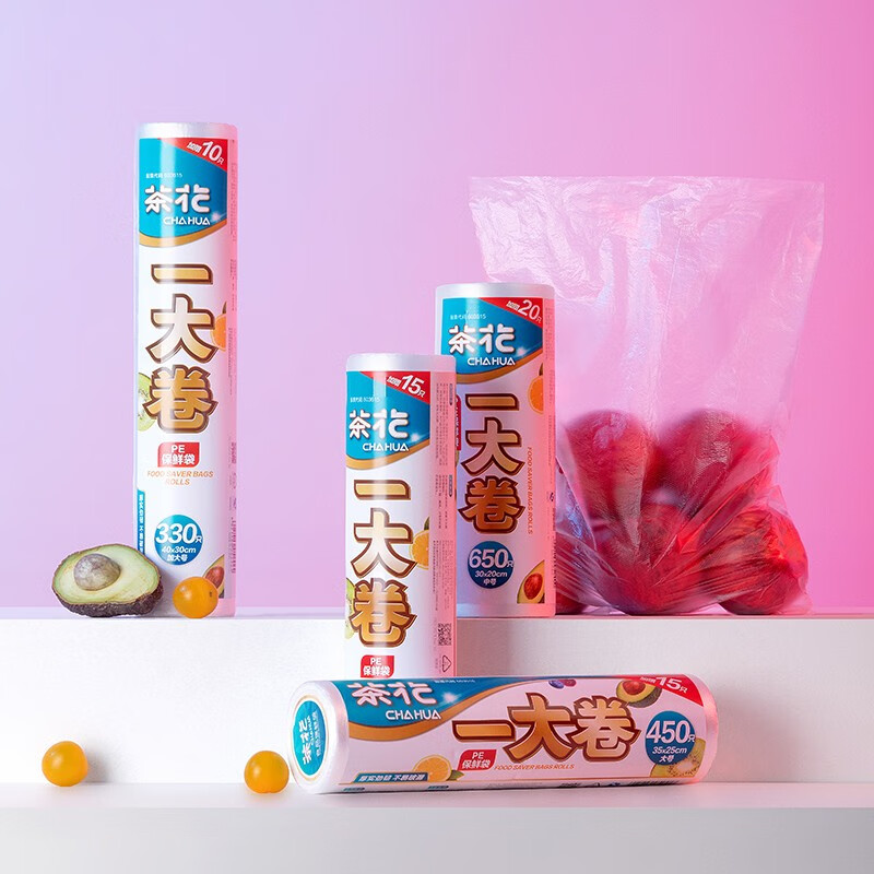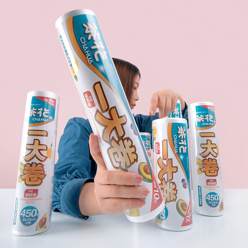 生活日用  > 日用杂货  > 日杂小件  >  茶花/CHAHUA  >  茶花一次性保鲜袋家用食品袋连卷密封袋 一大卷-大号330只 304012 304012/个