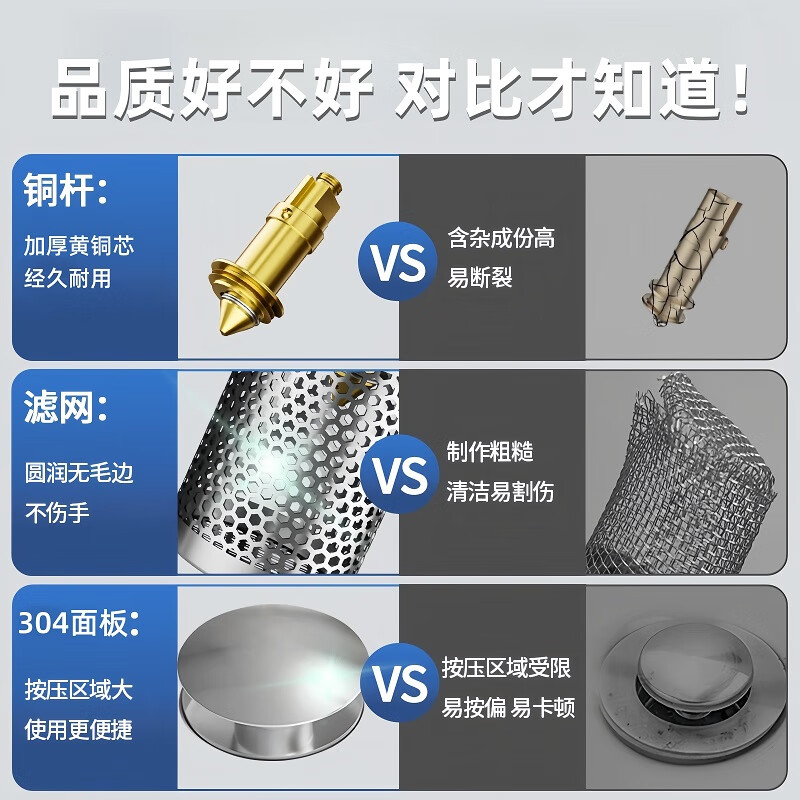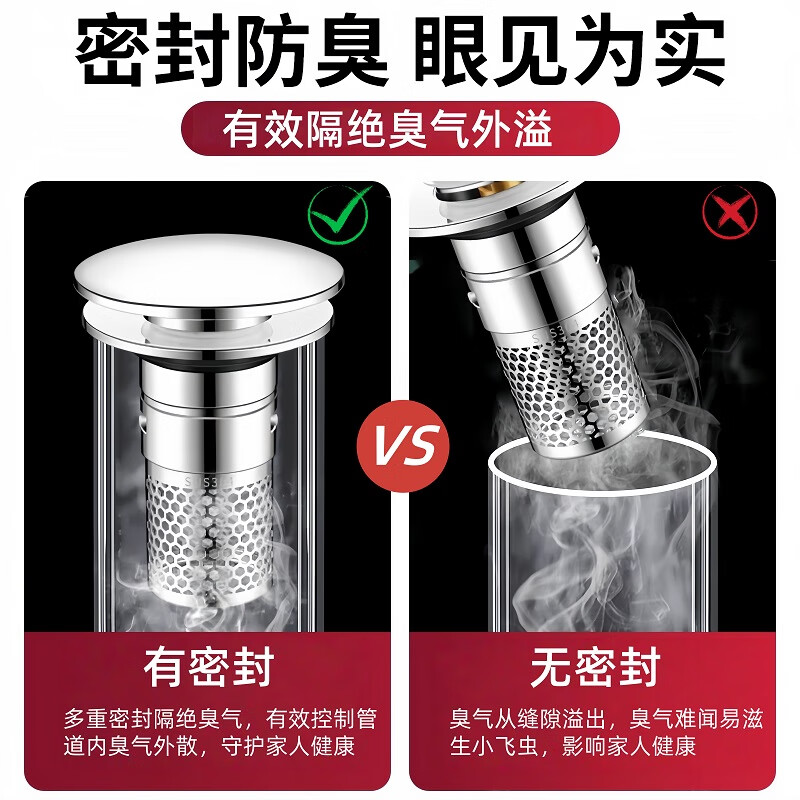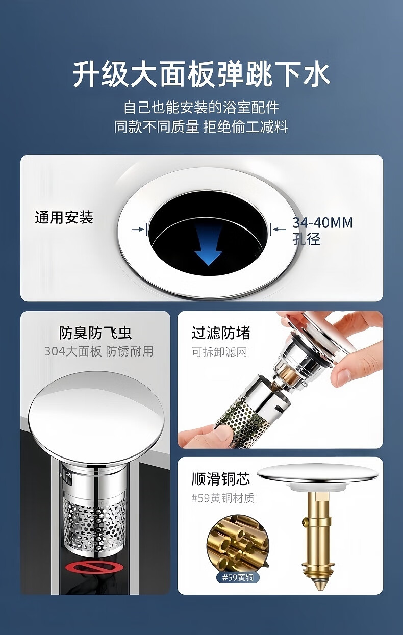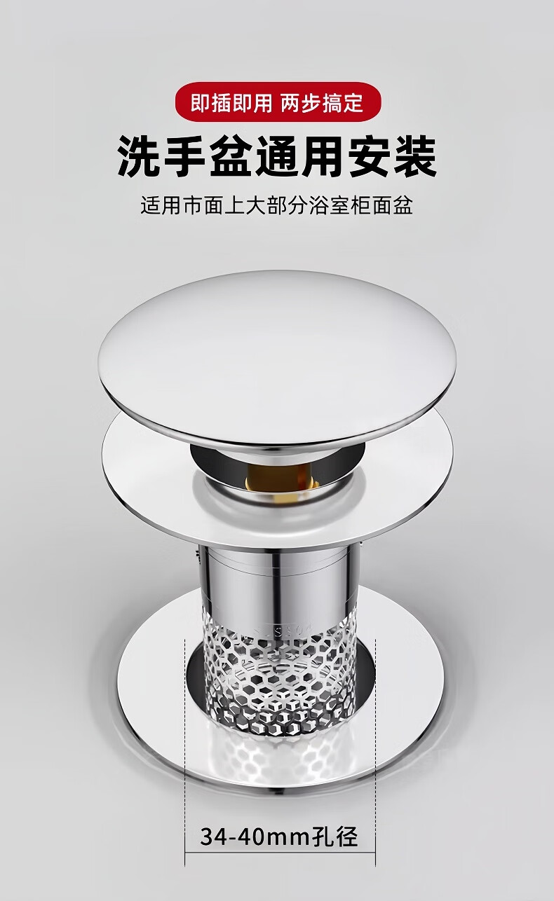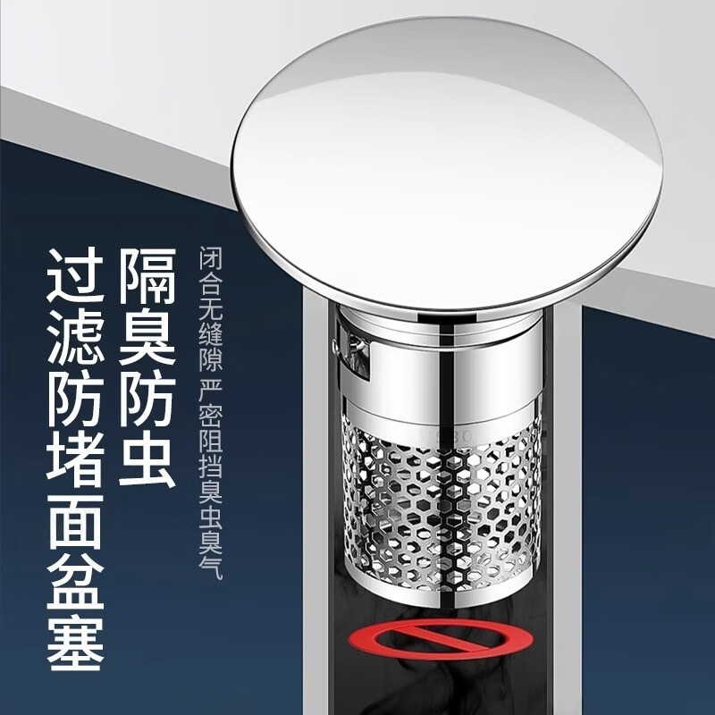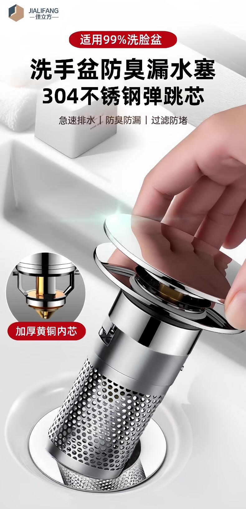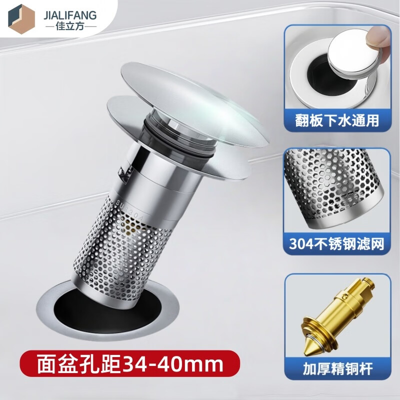 商品名称: 佳立方洗手盆漏水塞防臭弹跳下水器铜芯卫生间不锈钢过滤网防堵防虫水池 面盆弹跳芯下水器/个