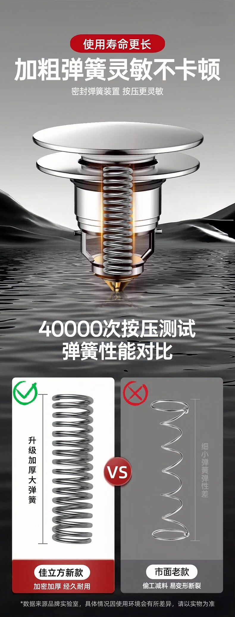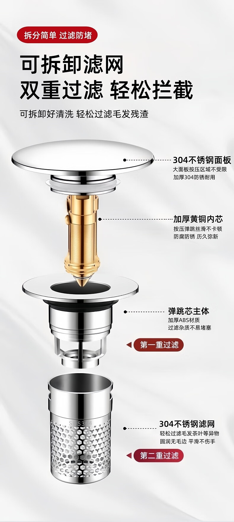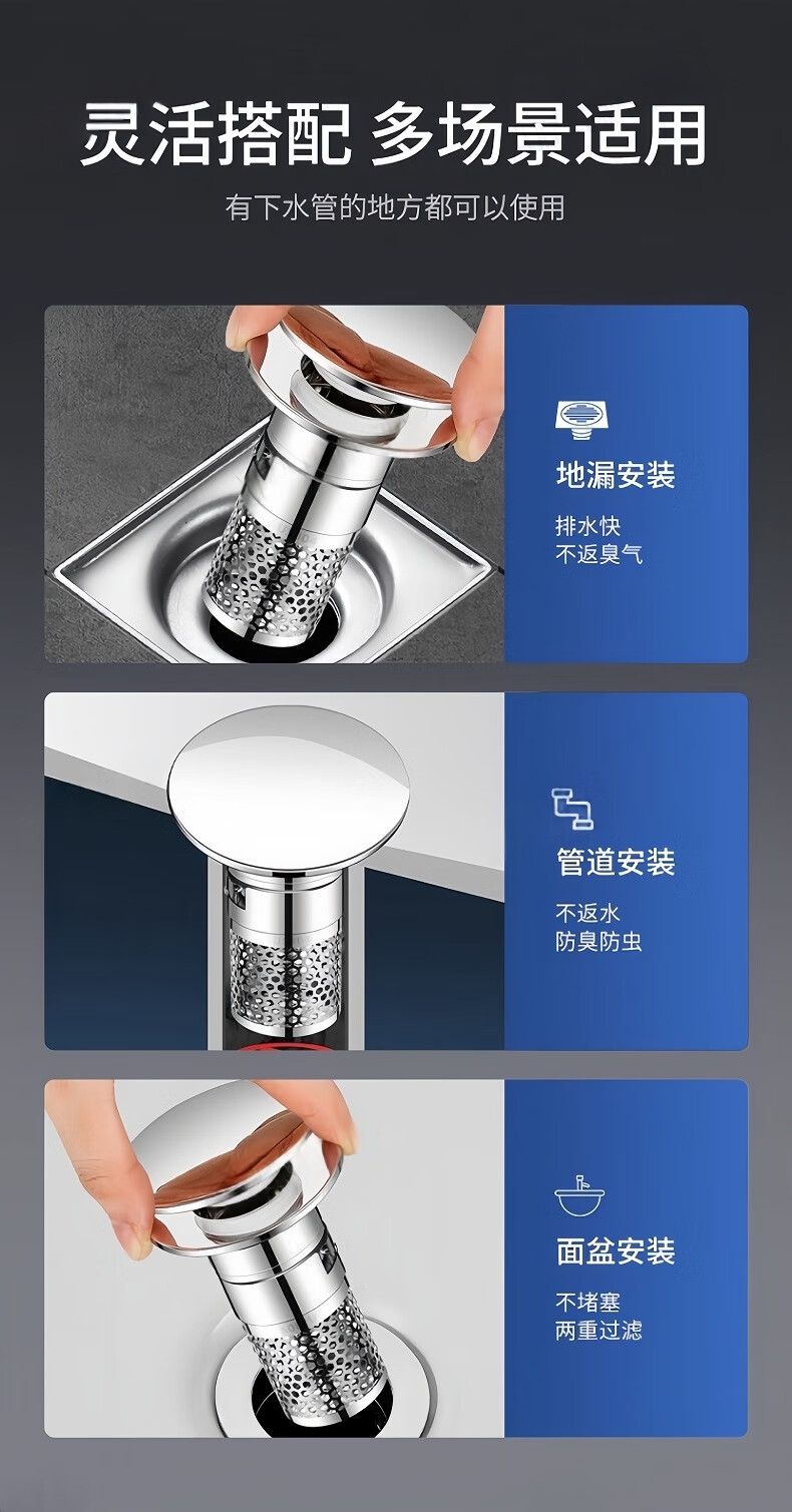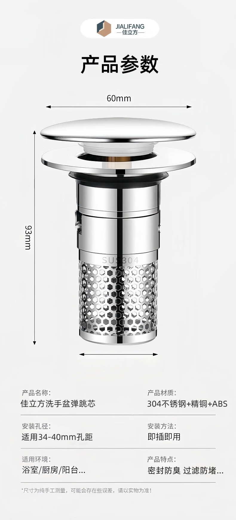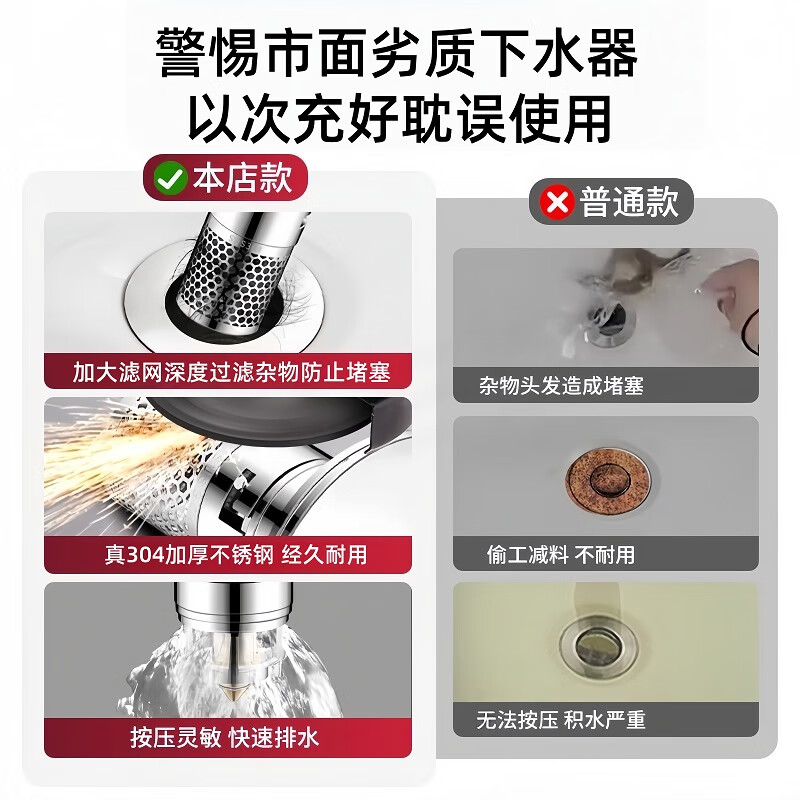 商品名称: 佳立方洗手盆漏水塞防臭弹跳下水器铜芯卫生间不锈钢过滤网防堵防虫水池 面盆弹跳芯下水器/个