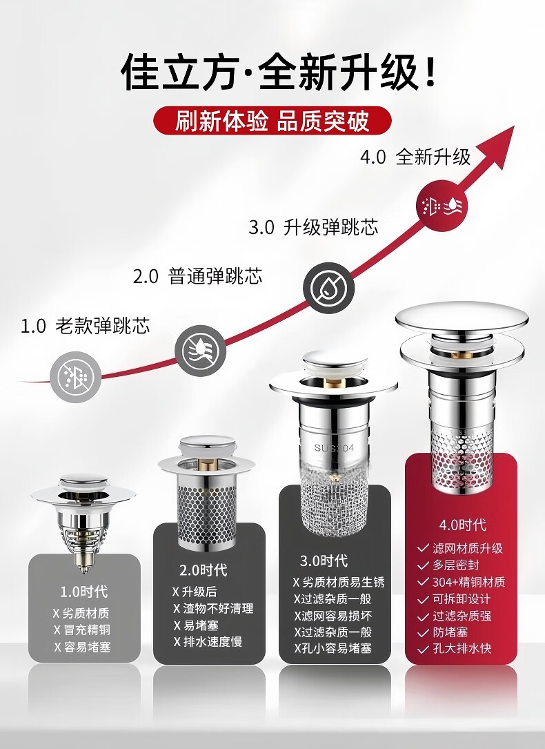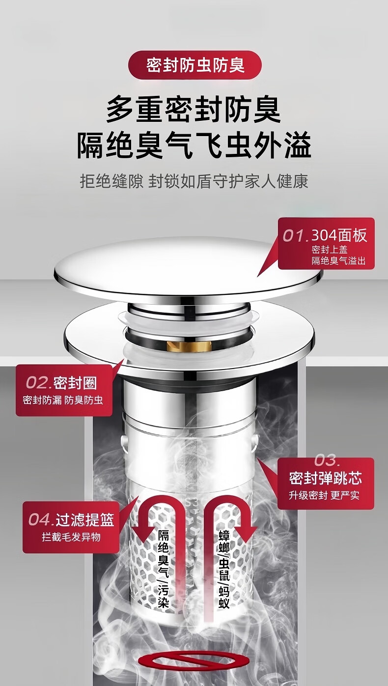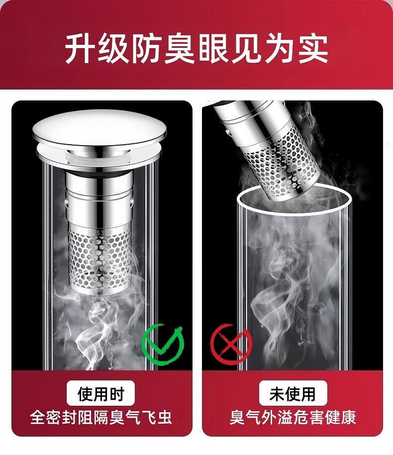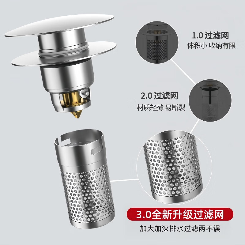 • 商品名称:佳立方洗手盆漏水塞防臭弹跳下水器铜芯卫生间不锈钢过滤网防堵防虫水池 面盆弹跳芯下水器/个