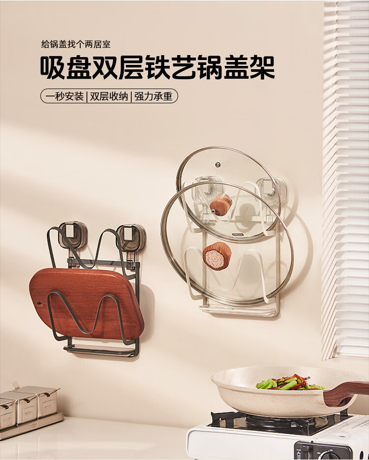 诺室吸盘铁艺锅盖架子免打孔锅盖放置器壁挂式厨房置物架多功能菜板架 J242092113820/个