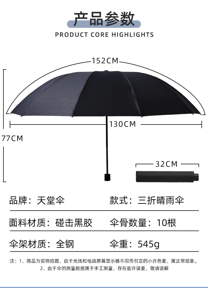 • 商品名称:天堂伞 晴雨伞超大号雨伞双人加大三折叠伞暗纹黑胶 38090EWHM颜色备注 38090EWHM/把
