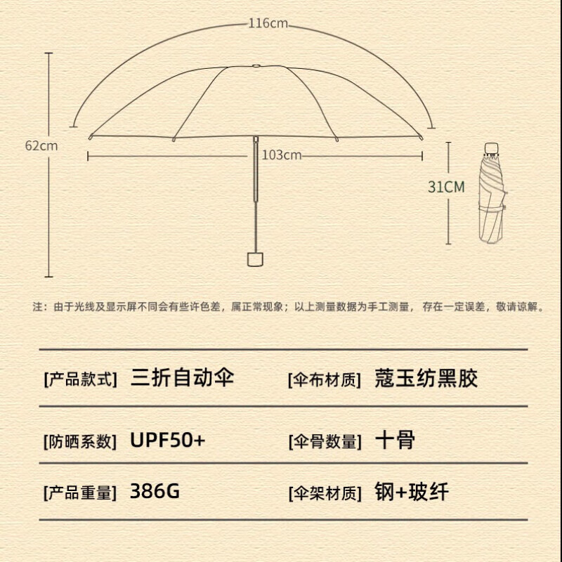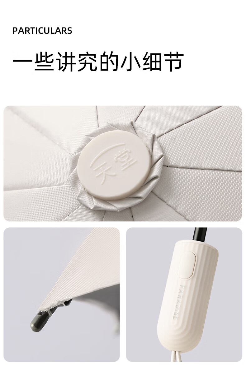 • 商品名称:天堂伞 全自动黑胶晴雨两用伞遮阳伞三折太阳伞防晒 31171风雅颜色备注 31171风雅/把
