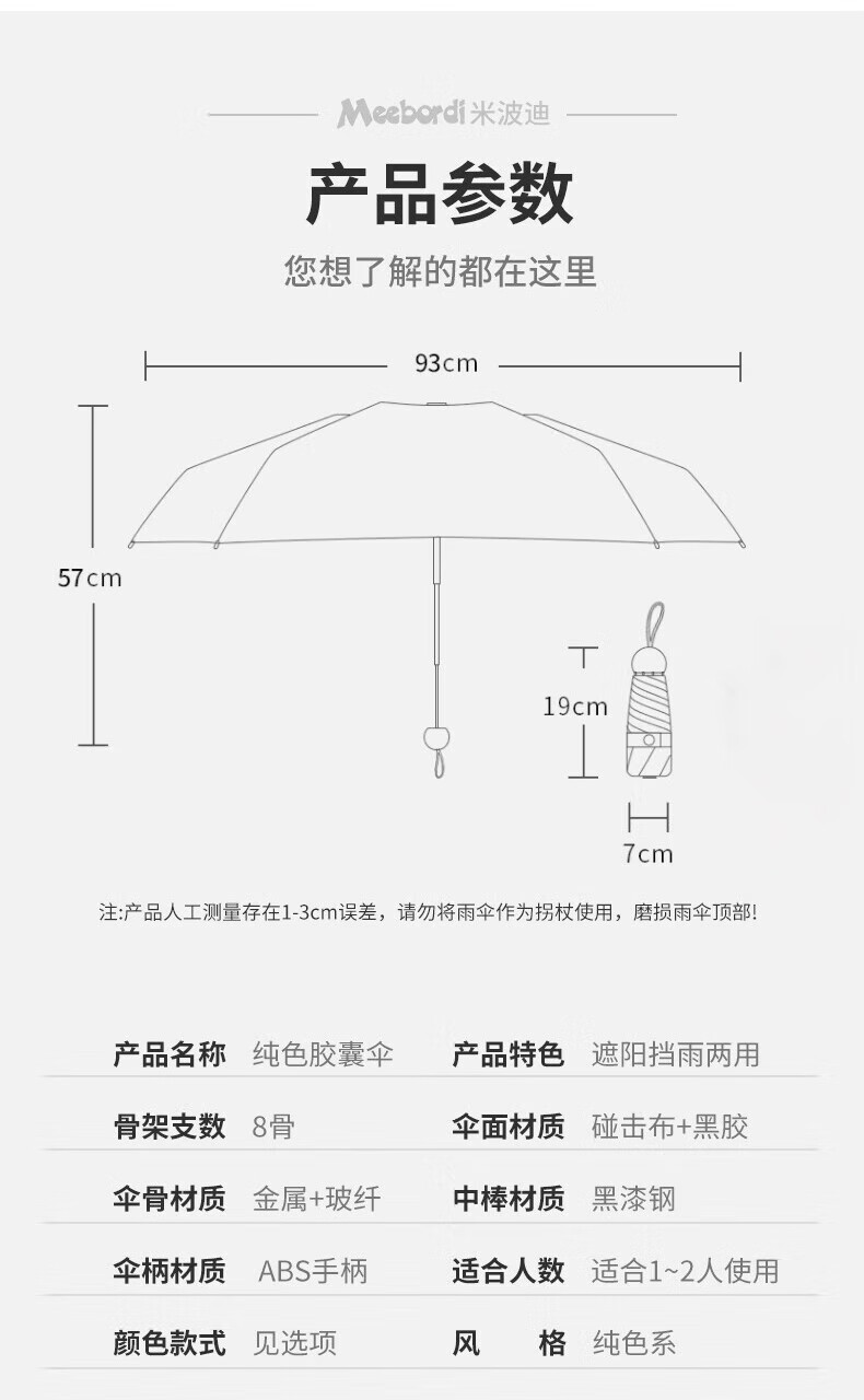 • 商品名称:米波迪(Meebordi)防晒防紫外线迷你小巧 五折叠伞晴雨两用胶囊雨伞便携送女友礼物 DC-050/把