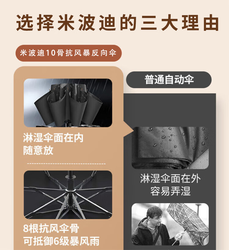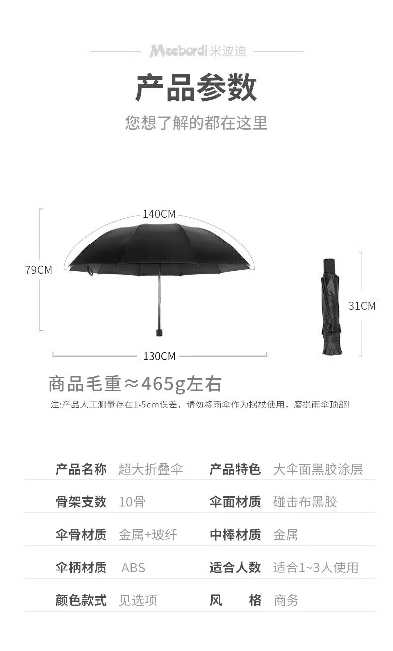 • 商品名称:米波迪(Meebordi)雨伞加固加厚结实抗风折叠伞晴雨两用三折叠超大反向雨伞防暴雨 DC-023/把