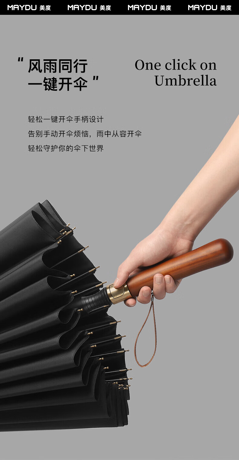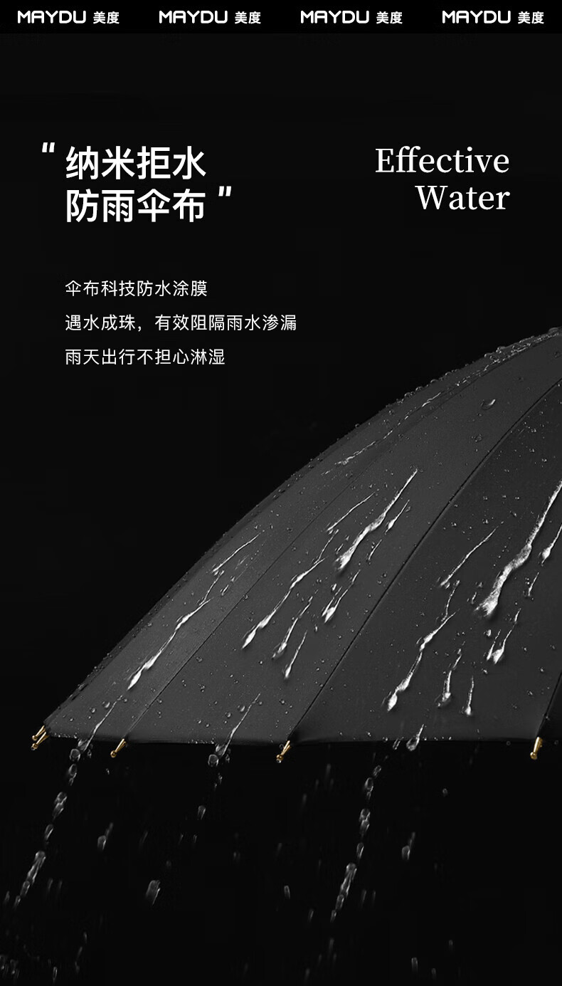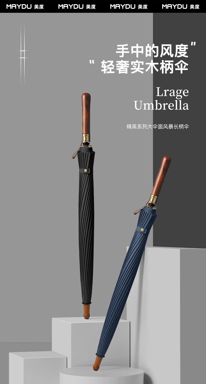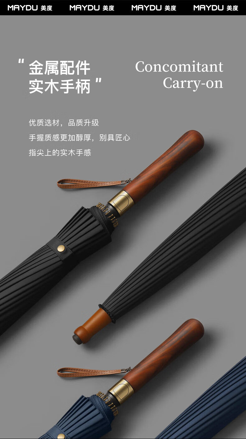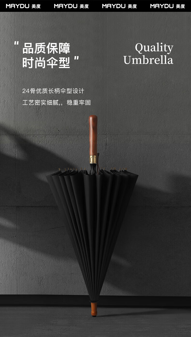 • 商品名称:美度(MAYDU)全自动24骨商务雨伞实木长柄加大防风晴雨双人伞 M8005夜幕黑 M8005/把
