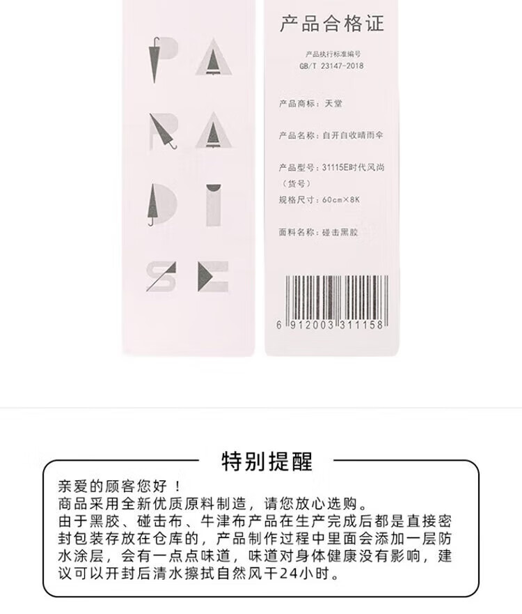 • 商品名称:天堂晴雨伞自动31115 黑色 晴雨伞/把