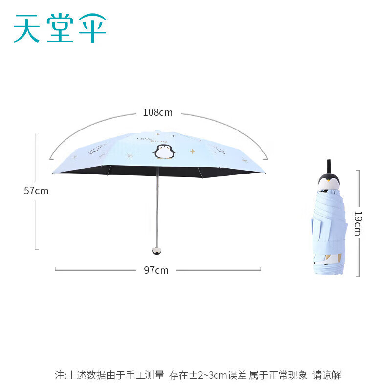 • 商品名称:天堂五折防晒遮阳晴雨两用伞 蔻玉纺黑胶 57122EC极地探险 净空蓝 57122EC/把