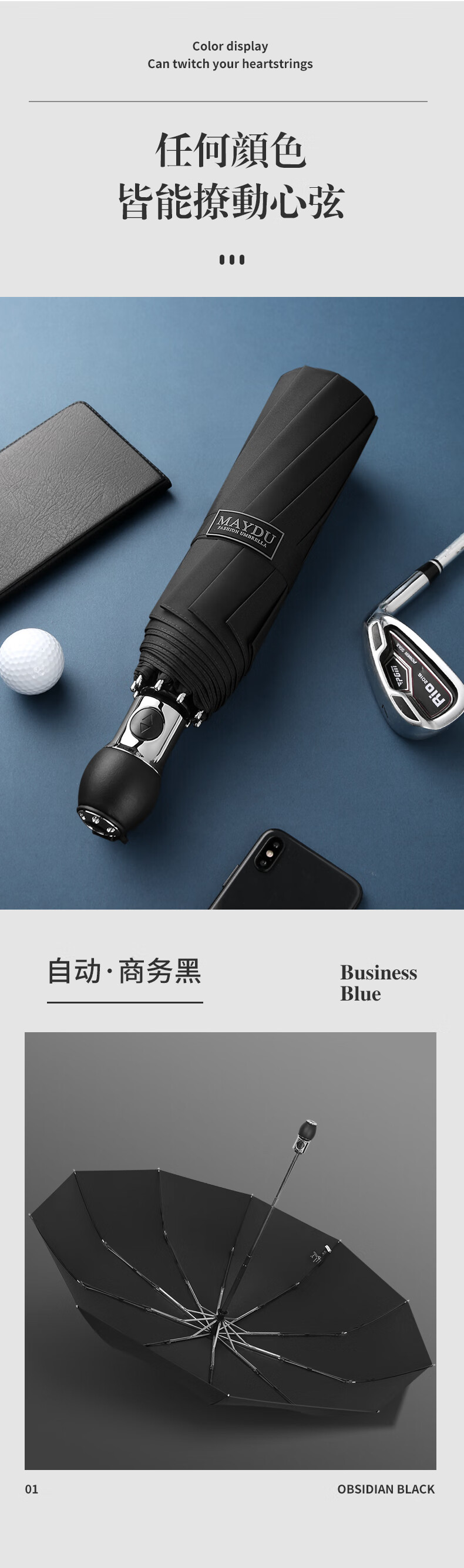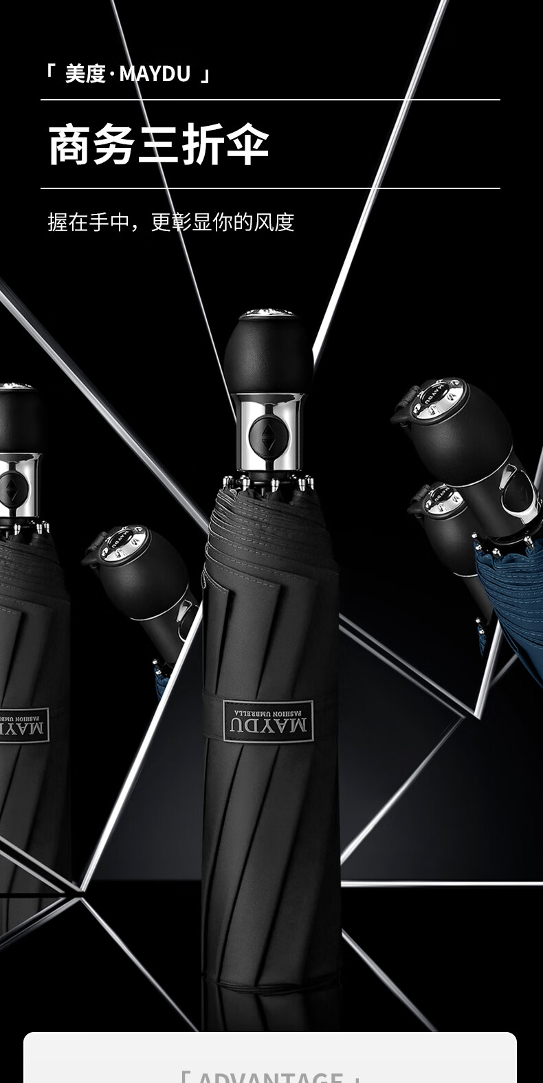 • 商品名称:美度(MAYDU)商务折叠晴雨伞全自动加大号三折遮阳伞 M3388藏青蓝 M3388/把