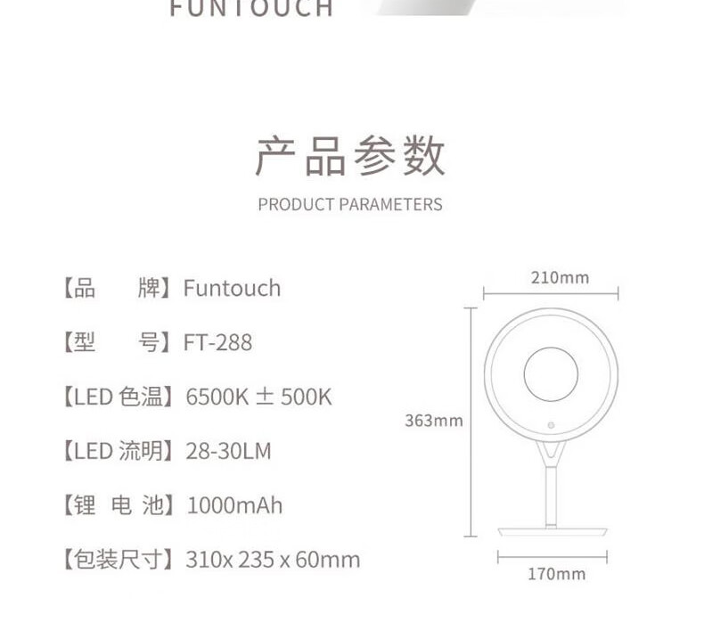 • 商品名称:斐色耐(FASCINATE)化妆镜 收纳一体带灯台式充电款梳妆补光镜子 FT-288 三色光 FT-288/个