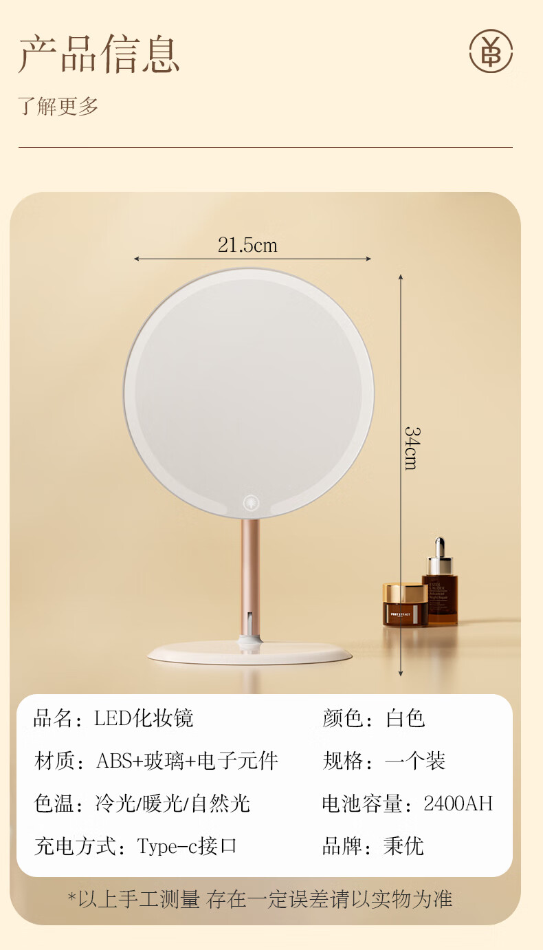 • 商品名称:秉优 双轴化妆镜带灯台式桌面学生宿舍家用可立办公室led美妆镜子旋转 秉优81214210/件