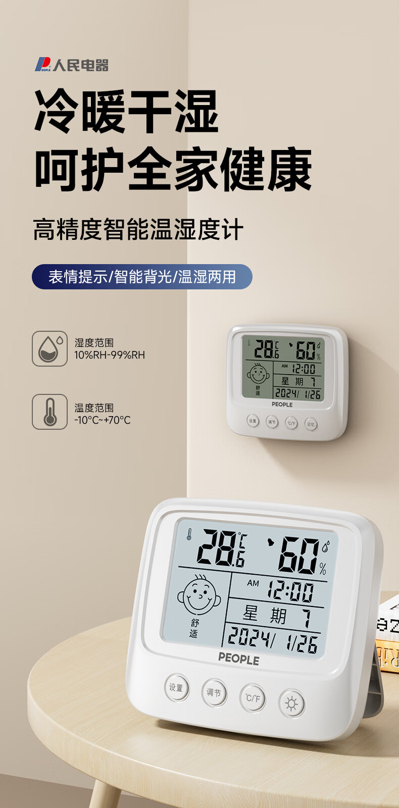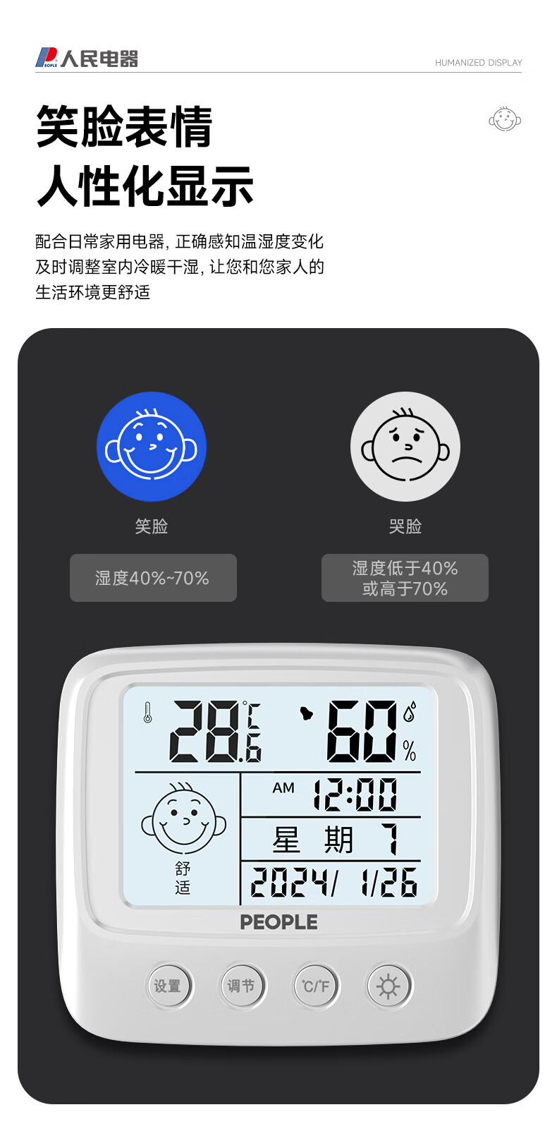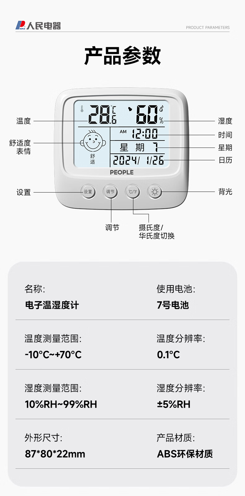 • 商品名称:人民家用室内温湿度计室内客厅婴儿房背光高精准灵敏温度计RE-W5017S RE-W5017S/个
