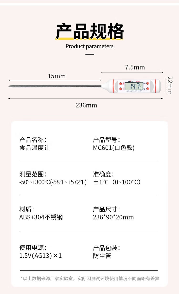 商品名称: MITIR食品温度计便捷式厨房测油温奶温水温食物烘焙测温计MC601白色 MC601白色/个